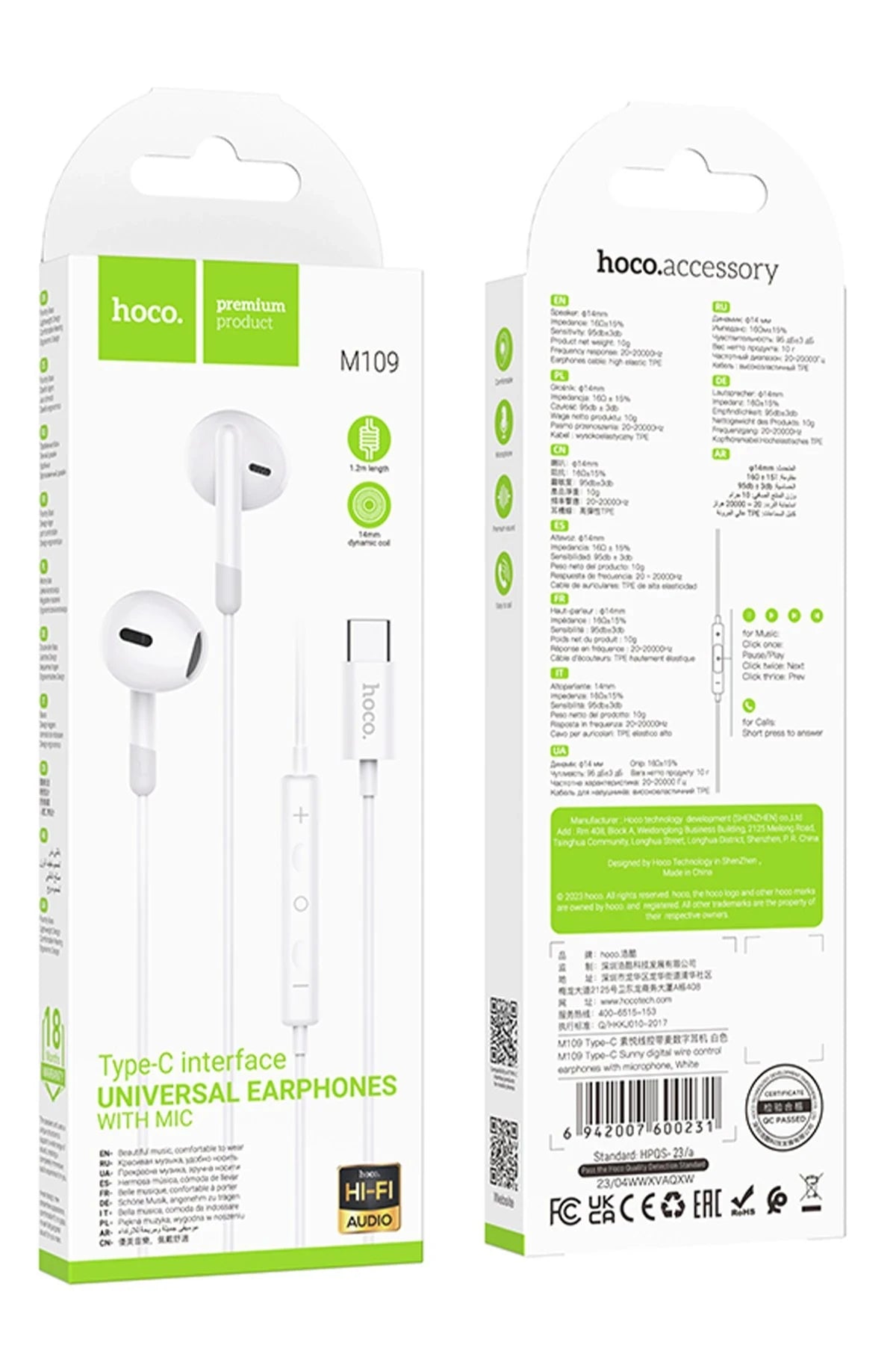Hoco. M109 Type-C Mikrofonlu Kablolu Kulaklık - Beyaz